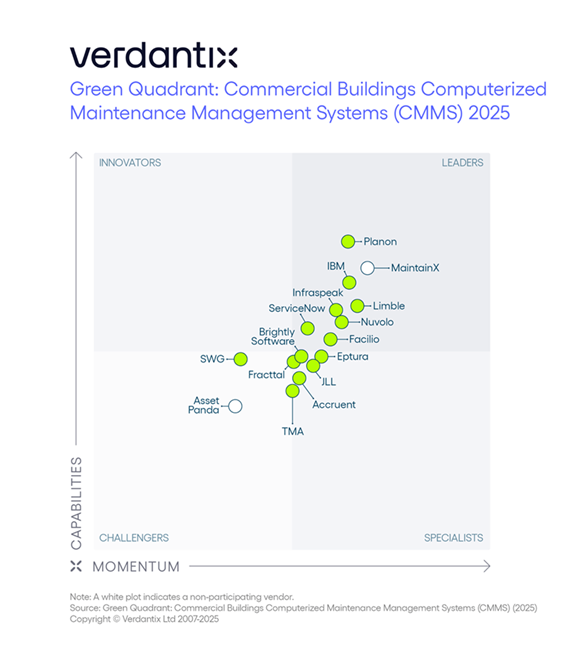 The Green Quadrant by Verdantix is the industry's most trusted independent benchmark for CMMS solutions. Verdantix evaluated 16+ global vendors through rigorous product demonstrations, detailed questionnaires, and customer interviews.